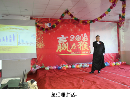 年会在现场激情、热烈、活跃的气氛中进行。首先,由公司总经理朱姚培先生上台向大家致辞。朱总总结性地回顾了2015年荣马大事记,引导大家一起回顾了荣马2015年的心路历程;提出了2016年荣马新的战略规划和销售目标;展望了荣马的未来并给大家送出了新年的美好祝愿;最后宣布了2016年荣马公司迎新年会正式开始。朱总的讲话热情洋溢,令人振奋的鼓励让员工们激情澎湃,憧憬着美好的明天。