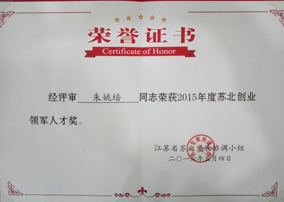 2016年05月04日,江苏省苏北发展协会小组颁发了2015年度创业领军人才的名单,我司总经理朱姚培位列其中,并被授予荣誉证书和奖杯。