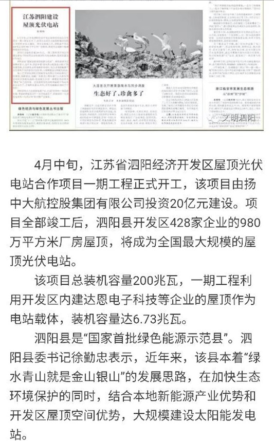 2016年4月中旬,江苏省泗阳县经济开发区屋顶光伏电站合作项目一期工程正式开工,该项目由扬中大航控股集团有限公司投资20亿元建设,该项目所有产品均由三亿体育注册登录提供。