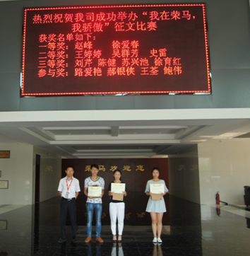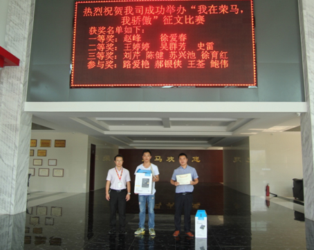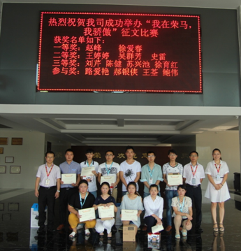 2016年07月28日早上8:30,在公司办公楼大厅举行“我在荣马,我骄傲”征文比赛颁奖,此次活动由各部门推荐文章参加比赛,并通过通知下发,稿件收集,文章评比及三个环节进行。前期大家反响热烈,同时在规定时间内将作品收集完毕,数量和质量均达预期。本次征文比赛本着公平,公正,公开的原则,通过初审、复审两个阶段分别选出了一等奖、二等奖、三等奖。