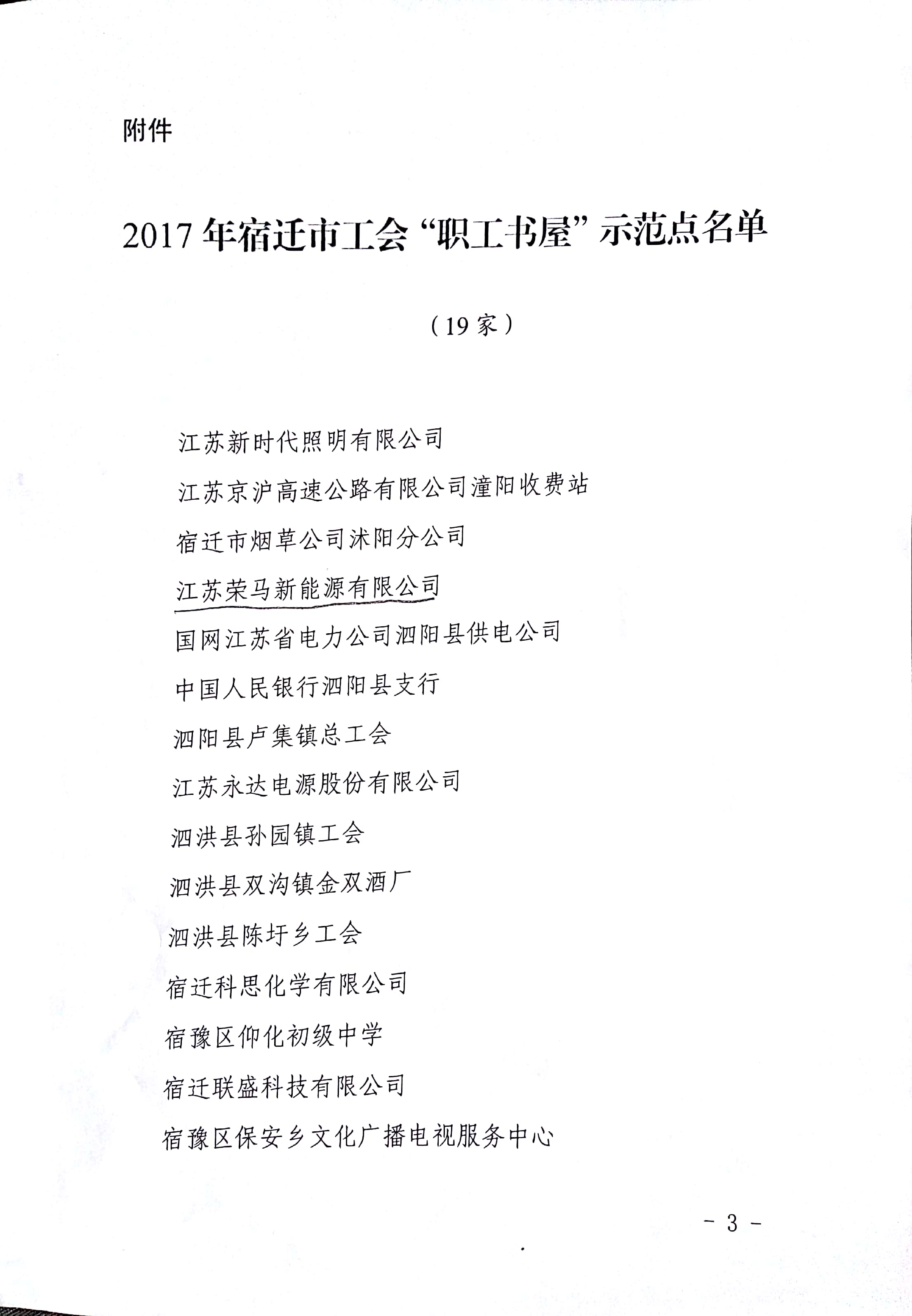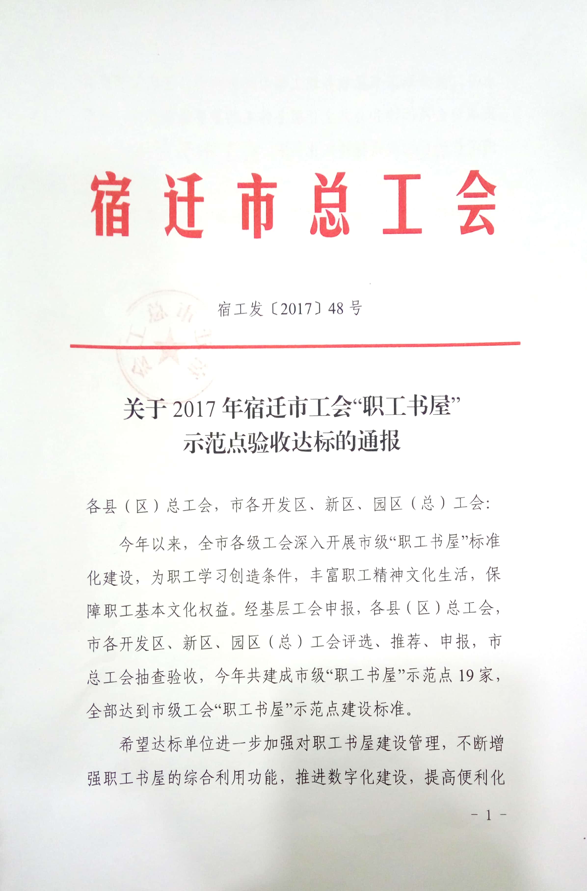 2017年10月30日,经县市各级工会审核批准,我司被授予2017年宿迁市工会“职工书屋”示范点荣誉称号。