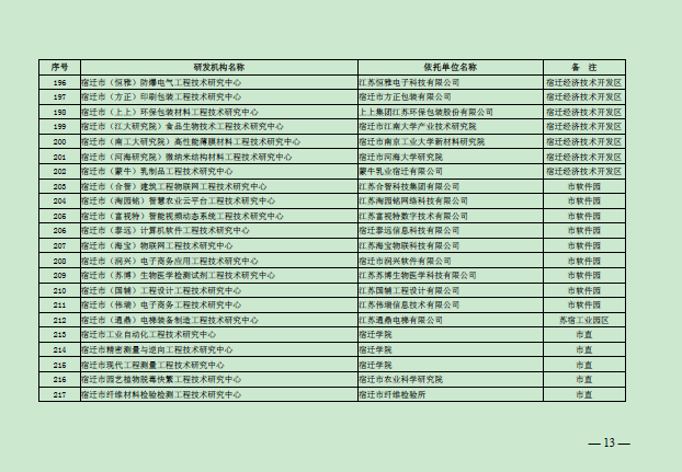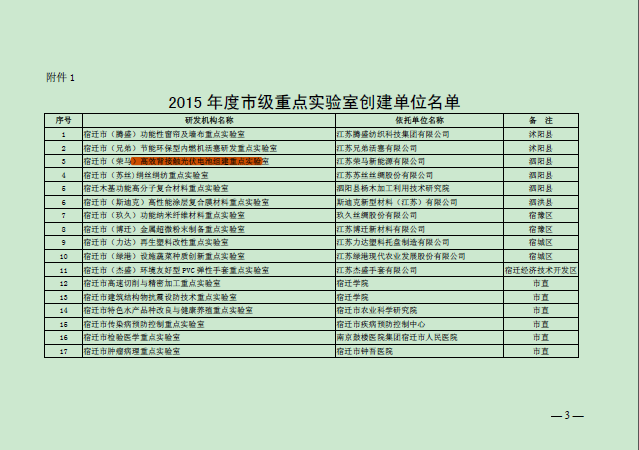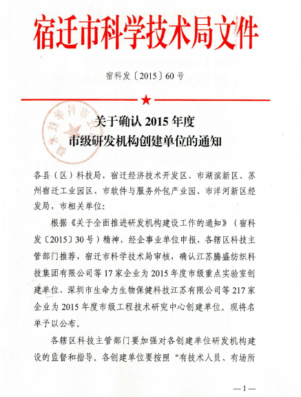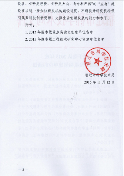2015年11月12日,宿迁市科学技术局认定小组公示了2015年宿迁市重点实验室获选企业名单,我司位列第三位。