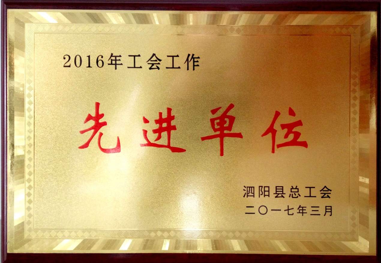 2016年,公司工会在宿迁市总工会、县总工会和公司党委的领导下,各项工作贴近实际,贴近职工,积极关心员工诉求,全力打造“和谐、温馨、活力”型工会,于2017年3月荣获泗阳2016年度先进单位荣誉称号。