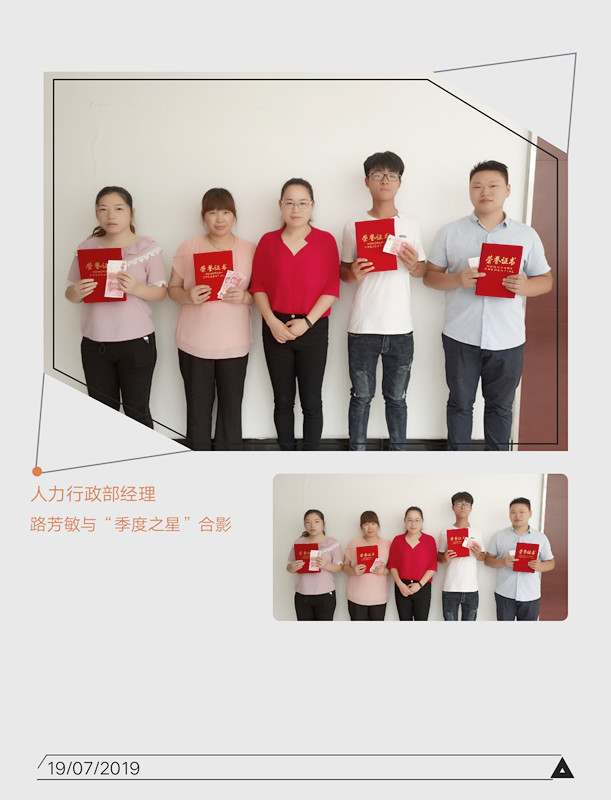 榜样是旗帜、榜样是路标、榜样是正能量的蕴藉和释放。优秀是改进,改进昔日懵懂的犯错和不对;优秀是自激,自激内心潜能的超强发挥。有成效的奋斗者是公司前进路上的火车头,千里马。为正确引导员工的职业发展方向,进一步培养和塑造员工的集体荣誉感,2019年7月16日我司人力行政部积极展开了2019年第二季度“季度之星”甄选活动。