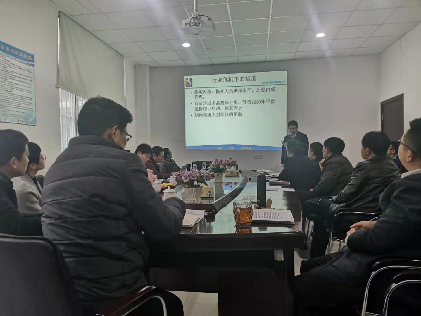 其中在述职报告议程中,我司王健总监首先给大家讲述了新能源2019年生产相关情况。从汇报中我们看到2019年我们的月产量已经达到了560多万片,单线产量达到行业的最好水平。紧接着是技术、设备、质量等部门分别对本部门工作进行汇报,从大家的汇报中能够看出大家的用心,用心总结、用心筹划、用心对待此次考核工作。最后是常总和朱总进行述职。其中朱总讲到当前光伏行业面临的是“面粉比面包还贵”的尴尬境地,基本上90%以上的多晶硅企业面临减产、停线。但是,我们从前两年就着手开发光伏电站,使得公司能够保证现金流,另外今年与东南大学合作成立的南京东博智慧能源研究院未来也会研究出新产品带动发展。相信2020年我们一定会活下去并且活得好!