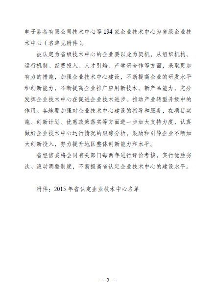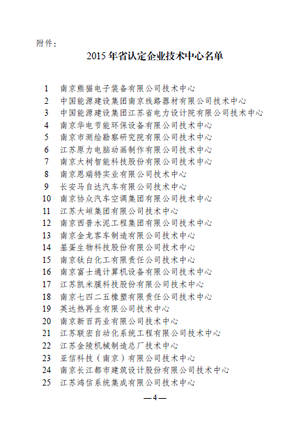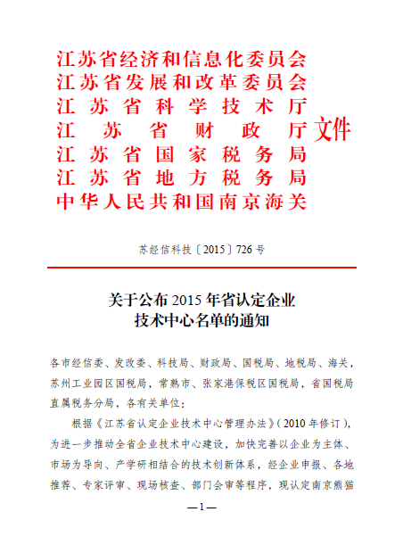 2015年11月03日,江苏省经信委认定小组公示了2015年江苏省企业技术中心名单,我司光荣入围,位序191。